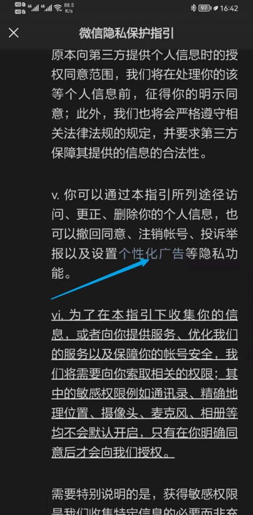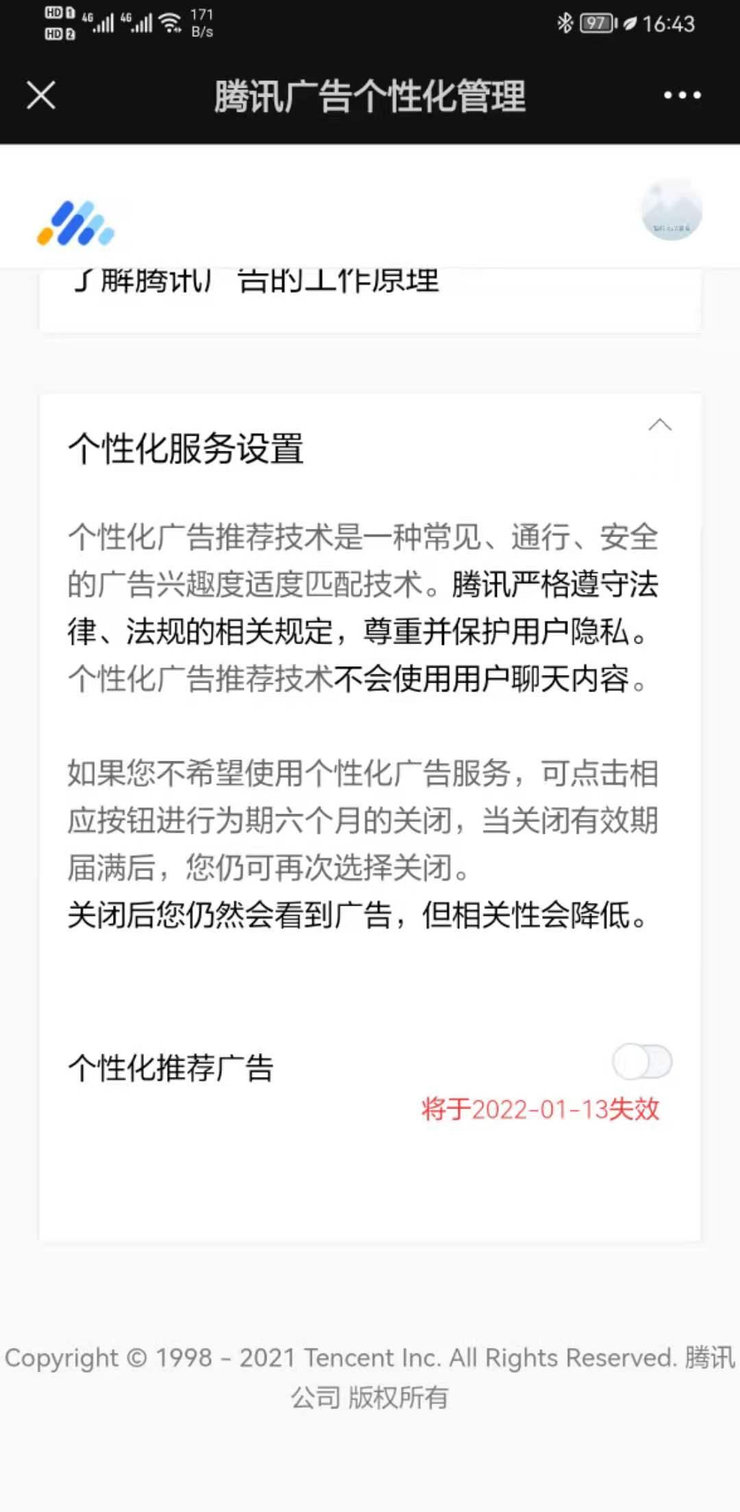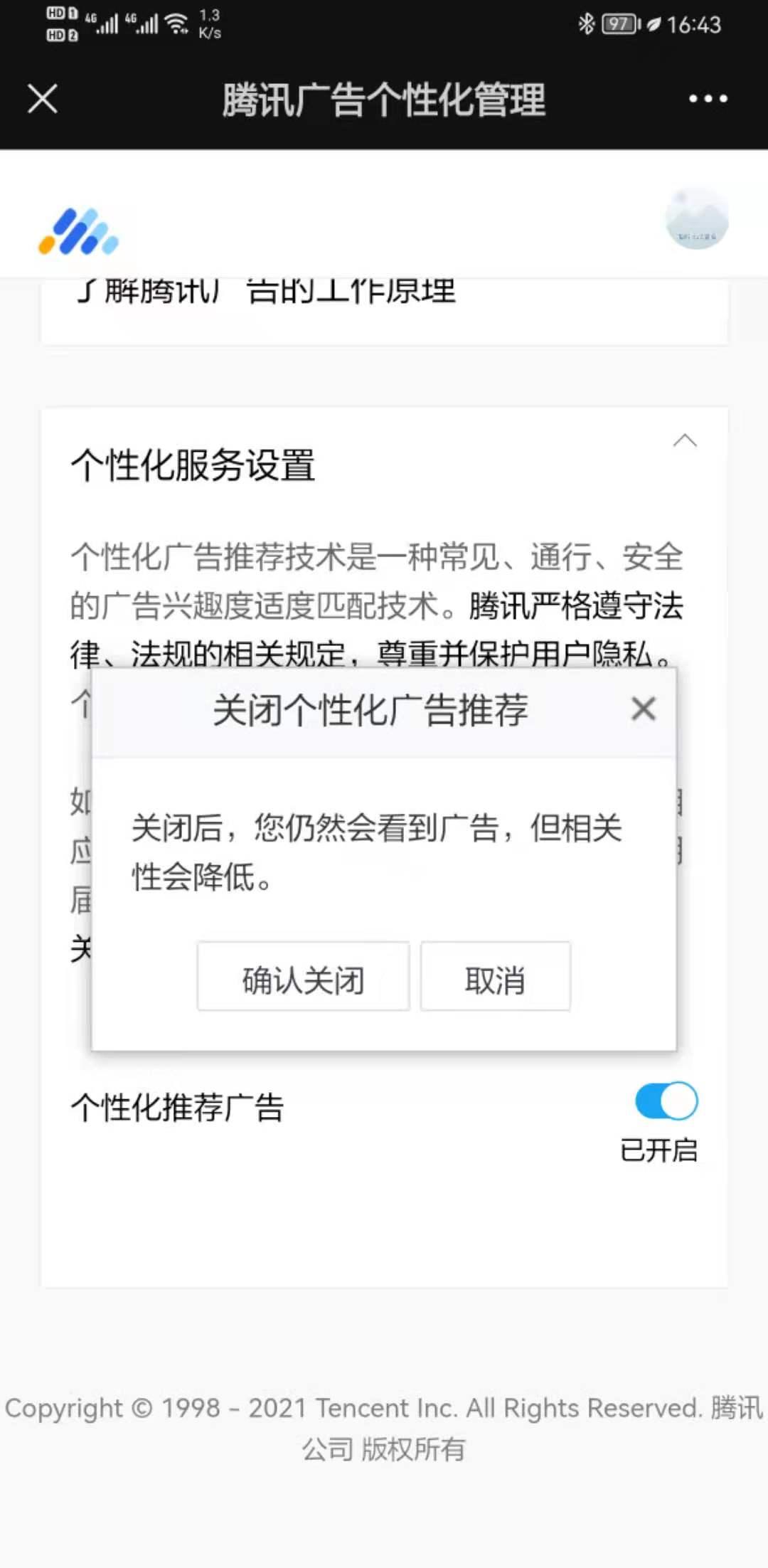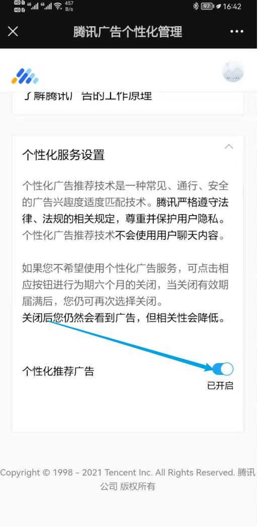 6、拉倒最低端,可以看到【个性化推荐广告】已经开启,这时只需将它关闭就能关掉 “监听”