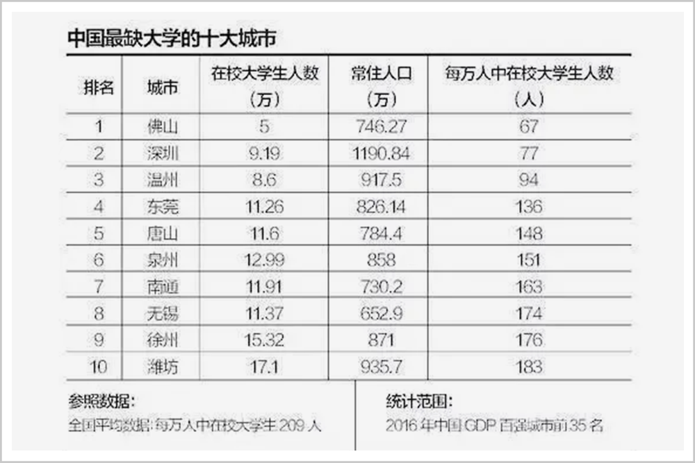 2017年,《经济观察报》发布“中国最缺大学的城市”排行榜,佛山以每万人67个在校大学生的绝对“优势”,“荣登”榜首。